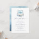 Esta elegante invitación a cenar a un boda costero incluye un escudo de bodas acuarela con iniciales en monograma de la novia y el novio, y la fecha boda en la pancarta del escudo.