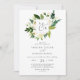 Esta elegante invitación a una boda con un monograma floral blanco es perfecta para un boda clásico. El moderno diseño vintage presenta un bonito y romántico rosa de marfil y acuarela crema y flores de peonía con hojas de color verde oscuro, vegetación y productos botánicos. Personalice la tarjeta con su monograma de iniciales.