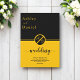 Esta elegante invitación a celebrar bodas en negro y oro es perfecta para un boda moderno. el diseño de lujo presenta una elegante caligrafía dorada sobre un fondo negro.