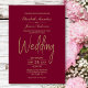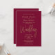 Una elegante invitación minimalista a la boda magenta con texto dorado.
