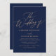 Invite a amigos y familiares a compartir la alegría de su boda con esta invitación moderna, con un guión elegante y una tipografía de oro sobre un rico fondo marino.