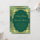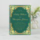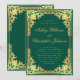 Esta elegante invitación a una boda de color verde esmeralda y dorado, con un aire vintage, presenta un marco dorado falso y ornamentado con elegantes decoraciones barrocas doradas sobre un fondo verde esmeralda. Los nombres de la novia y del novio están escritos en un elegante guión caligráfico. Todo el texto puede ser personalizado y tiene un color dorado similar al dorado vintage. El marco de oro falso vintage y ornamentado se basa en un encuadernador de libros francés antiguo, de Georges Mercier (1885-1939) - Madame de Maupin por Theophile Gautier, edición 1911, ahora de dominio público.