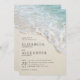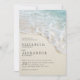 Esta elegante invitación a bodas en la playa de verano incluye una foto de primera plana de una playa con una ola oceánica y una miga marina enmarcando la tipografía clásica justificada a la izquierda.