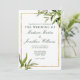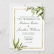 Esta elegante invitación a la boda botánica está enmarcada con hermosas hojas de acuarela verde y bonitos de oliva. Esta hermosa vegetación y el color oscuro de la espalda son perfectos para un evento de caída de moda para una novia y un novio modernos. Enmarcado con un precioso rectángulo dorado detrás del acento de la hoja verde.