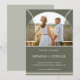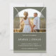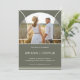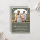 Sencillo y elegante arco de fotos de color verde oliva silenciado con invitación a boda superpuesta.