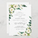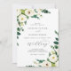 Esta elegante invitación a la boda floral blanca es perfecta para un boda clásico. El moderno diseño vintage presenta un bonito y romántico rosa de marfil y acuarela crema y flores de peonía con hojas de color verde oscuro, vegetación y productos botánicos.