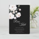 Delicadas rosas blancas en la esquina superior izquierda de esta elegante y minimalista invitación a la boda de fondo negro. Detalles de la invitación a la boda en tipografía gris claro.