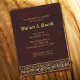 Cinta floral de oro vintage como el diseño en un oscuro burdeos y abstracto negro simulando un fondo de tela suave. Es elegante y refinado. La caligrafía inglesa antigua combinada con la serif New Gothic sans van muy bien juntas. Ambas fuentes en oro que coinciden con los colores del detalle de encaje leen claramente y establecen el tono del evento. La parte trasera de la tarjeta tiene el mismo diseño de arte abstracto y sólo las iniciales de las parejas, ¡después de todo es su día de celebración!