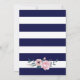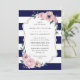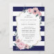 Elegante invitación de boda floral azul marino y ruidosa con flores de color rubor enmarcando los detalles del boda en un fondo de rayas azul marino y blanco. Elementos coincidentes disponibles.
