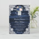 Rústica invitación a bodas floridas de color azul marino y rubor con un ramo de rosas y flores de aliento de bebé dentro de un frasco de albañilería contra un fondo de madera de granero adornado con encajes florales blancos y luces de cuerdas. Diseño perfecto para invitar a sus invitados a su fiesta de bodas rústica azul marino y ruidosa. Personalice fácilmente esta invitación de boda con los detalles de su boda en línea. Diseño de personalizable completo. Elementos coincidentes disponibles.