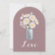 La sencillez de un ramo de margaritas blancas, con la ayuda del tipo de letra blanco, crea un diseño boda elegante y minimalista. El papel Kraft agrega un encantador telón de fondo rústico. El texto es totalmente editable. La parte trasera de la tarjeta está decorada con un frasco de albañil lleno de margaritas y la palabra "amor".
