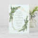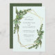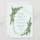 Elegante invitación de bodas de verano con vegetación botánica acuarela y marco geométrico de Relieve metalizado de oro falso con un color de fondo de menta claro. Sus detalles se muestran en una tipografía moderna y elegante que combina fuentes sans-serif y script. Esta invitación vuelve a un fondo verde oscuro con un delicado patrón botánico.