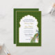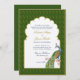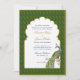Elegante pavo real acuático en un arco dorado con una rica invitación a bodas de paisajes dorados y verde oscuro. Perfecto para bodas indios.