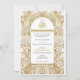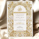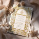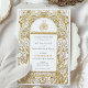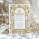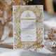 Invite a sus huéspedes a su día especial con elegancia y elegancia con nuestra Elegante Invitación a la Boda Islámica. La fachada presenta un impresionante diseño de inspiración Art Nouveau en una lujosa paleta de colores falsos de oro, elementos naturales muy bien entrelazados con motivos ornamentales que enmarcan la sagrada Bismillah islámica en una elegante caligrafía árabe. La parte posterior complementa la parte delantera con un diseño a juego, proporcionando detalles bodas esenciales en una armoniosa mezcla de tonos dorados y marfil blanco. Esta invitación vertical captura la esencia del patrimonio cultural y la elegancia moderna, perfecta para las parejas que buscan una manera elegante y respetuosa de anunciar su unión.