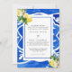 Lemones acuarelas. Baldosa mediterránea. Invitación a la boda. Floral de elementos florales mediterráneos en la parte posterior. Marco azul.