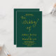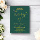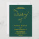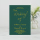 Esta elegante invitación de boda verde y dorada es perfecta para una boda moderna. el diseño simple presenta elegante caligrafía dorada sobre un fondo verde.
