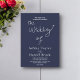 Esta elegante invitación a la boda azul marino es perfecta para un boda moderno. el diseño es sencillo, con una elegante caligrafía blanca sobre un fondo azul.