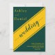 Esta elegante invitación a la boda de oro y verde es perfecta para un boda moderno. el diseño es sencillo, con una elegante caligrafía de oro sobre un fondo verde.