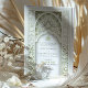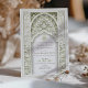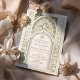 Presentando una hermosa invitación a la boda islámica que muestra un exquisito diseño de arco floral en una paleta de blancos y verdes suaves. El frente de la invitación muestra una delicada interacción de elementos florales blancos y follaje verde tierno, enmarcado en un arco islámico ornamentado, coronado con un tradicional motivo caligráfico árabe. La parte trasera se completa con un diseño cohesivo, con sutiles iniciales de la pareja en un tono verde que combina. Esta invitación encarna el intrincado arte de los patrones islámicos, lo que lo hace perfecto para una pareja que desee honrar su herencia mientras celebra su unión con estilo. El diseño se inspira en el enfoque del arte islámico en los patrones florales y la simetría geométrica, creando una sensación de elegancia atemporal.