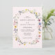 Elegantes invitaciones florales a bodas con detalles bodas rodeados por un marco oval de flores silvestres acuáticas y follaje en tonos rosas, amarillos, violetas, azules y verdes con un fondo rosa rubor. Se invita al reverso a un ramo de flores silvestres y vegetación. Las rústicas invitaciones a las bodas de flores silvestres son perfectas para los bodas de primavera y verano.
