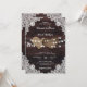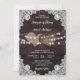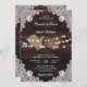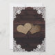 Invitación de boda rústica romántica de campo con dos corazones de arpillera contra un fondo de madera de granero adornado con encaje floral blanco y luces de cuerda. Diseño de tarjeta perfecto para invitar a sus invitados a su boda de tema rústico de campo.