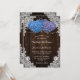 Invitaciones a bodas de color púrpura y azul personalizado con dos flores de hortensias en forma de corazón sobre un fondo de madera de granero adornado con encajes florales blancos y luces de cuerdas. Una boda elegante y romántica invita a su fiesta de bodas rústica morada y azul. Elementos coincidentes disponibles.