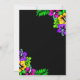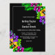 Esta elegante invitación a las bodas tropicales es perfecta para un boda de verano moderno. El diseño es sencillo, con flores amarillas, violetas y rosadas floridas, con una tipografía blanca elegante sobre un fondo negro atrevido.