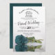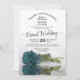 Esta hermosa invitación está diseñada para parejas que han decidido llevar a sus bodas a internet debido a la actual pandemia. Cuenta con un diseño magnífico con caligrafía de escritura de encaje, un único rosa verde azulado de tallo largo o de color turquesa que refleja en un estanque de agua. Una forma maravillosa de invitar a sus amigos y familiares a compartir en su día especial, aunque las circunstancias impidan una reunión física.