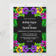Esta elegante invitación a las bodas tropicales es perfecta para un boda de verano moderno. El diseño es sencillo, con flores amarillas, violetas y rosadas floridas, con una tipografía blanca elegante sobre un fondo negro atrevido.