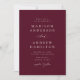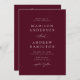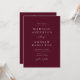 Elegantes invitaciones de boda todo en uno con sus nombres e información de la ceremonia boda en el frente con letras blancas con un fondo borgoñoso. Un guión moderno de caligrafía completa el aspecto de esta invitación a la boda burdeos de moda. Personalice la parte posterior de las invitaciones de boda caligráficas con detalles bodas como información de recepción, alojamiento de hotel, instrucciones RSVP y sitio web de bodas. Agregue el enlace deseado del sitio web del boda a la plantilla de código QR proporcionada para que sus huéspedes puedan ver fácilmente RSVP en línea y obtener información adicional sobre el boda. Esta burlona invitación a la boda con código QR es perfecta para bodas formales e informales de cualquier temporada.