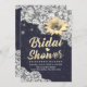 Plantilla de invitaciones a duchas nupciales - Elegantes girasoles, marco de encaje vintage y cadenas de Moda sobre fondo azul marino. ¡Un Diseño Perfecto Para Tu Gran Día! Todos Los Estilo De Texto, Los Colores Y Los Tamaños Se Pueden Modificar Para Ajustarse A Sus Necesidades.