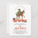 ¡Prepárate para celebrar un cumpleaños real con un giro medieval! Esta capilla caprichosa cuenta con un caballero atormentado en una capa verde que monta un cordero noble. El nombre del niño de cumpleaños brilla en una elegante tipografía naranja, diseñada para coincidir con la grandeza del cabo de un caballero. Los detalles del fiesta (hora, fecha y ubicación) se presentan en un tipo de letra negro elegante para facilitar su lectura en un fondo blanco y nítido. Voltea y encontrarás un fondo de naranja quemado, continuando con el tema real. Perfecto para un día de caballeros, caballos y aventuras, este diseño garantiza un inolvidable bash medieval. Ideal para las fiestas de cumpleaños de los niños con un toque medieval divertido.