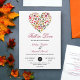 Esta elegante invitación a la boda de otoño es perfecta para un boda moderno de otoño. El diseño es sencillo y presenta un corazón colorido de hojas caídas con una tipografía elegante en negro y rojo sobre un fondo blanco