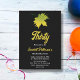 Esta elegante invitación al cumpleaños de otoño es perfecta para un cumpleaños de otoño moderno. El diseño es sencillo, con hojas de otoño verdes y una tipografía elegante en blanco y amarillo sobre un fondo negro.