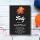 Esta elegante invitación al cumpleaños de otoño es perfecta para un cumpleaños de otoño moderno. El diseño es sencillo, con hojas de otoño verdes y una tipografía blanca elegante sobre un fondo negro.