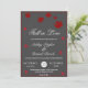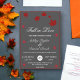 Esta elegante invitación a la boda de otoño es perfecta para un boda moderno de otoño. El diseño es sencillo y está decorado con hojas de color burdeos y una tipografía blanca elegante sobre un fondo gris oscuro