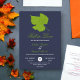 Esta elegante invitación a la boda de otoño es perfecta para un boda moderno de otoño. El diseño es sencillo, con hojas de otoño verdes y una tipografía elegante en blanco y verde sobre un fondo azul marino.
