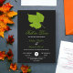 Esta elegante invitación a la boda de otoño es perfecta para un boda moderno de otoño. El diseño es sencillo, con hojas de otoño verdes y una tipografía blanca y verde elegante sobre un fondo negro.