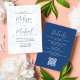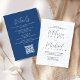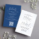 Este diseño presenta un código QR elegante invitación a una boda floral azul polvorienta con una plantilla simple de un sitio web rsvp, un elegante texto de escritura de caligrafía a la moda, información detallada respuesta de los invitados, un clásico moderno minimalismo, con un escaneado generador de códigos QR, una elegante hoja de follaje verde, un enlace URL de dirección web, una suave flor de rosa de jardín romántico, una suite tradicional de papelería formal.