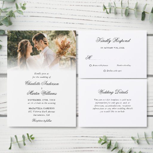Complementa su fiesta de boda con estas invitaciones de boda con fotos modernas que incluyen un tipo de guión elegante. Personaliza fácilmente estas invitaciones de boda con tus fotos y detalles de boda. Elementos coincidentes disponibles.