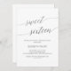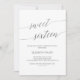 Esta elegante caligrafía plateada dulce invitación de dieciséis años es perfecta para una simple fiesta de cumpleaños. El diseño neutro cuenta con una tarjeta minimalista decorada con una tipografía romántica y caprichosa de imitación de Relieve metalizado plateado. Atención: este diseño no presenta un Relieve metalizado plateado real. Es un gráfico de alta calidad hecho para parecer un Relieve metalizado plateado.