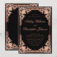 Elegante negro y rosa (invitación a la boda con aire vintage) con un marco rosa ornamentado con elegantes decoraciones barrocas (falsas) de oro subió en las esquinas, sobre fondo negro. Los nombres de la novia y del novio están escritos en un elegante guión caligráfico. Todo el texto se puede personalizar y tiene un color rosado similar al del marco. El marco vintage, ornamentado, se basa en un enlace de portada de libros antiguos franceses, de Georges Mercier (1885-1939) - Madame de Maupin por Theophile Gautier, edición 1911, ahora de dominio público.