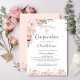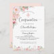 Hermosa invitación chica de acuarela floral Confirmación con exquisito arreglo floral en la esquina superior izquierda y campo de flores en el fondo de la tarjeta, con flores en melocotón delicado, tonos rosa rubor con detalles rosas de purpurina dorado y vegetación de menta. La carta está de vuelta a la sombra de la menta verde con detalles florales en el fondo. Invitación con sección para detalles de "Ceremonia" y "Recepción". Parte de nuestra colección de eventos y bodas "Mint Elegance".