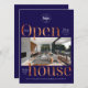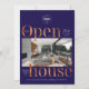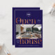 Crea negocios modernos invitaciones para tu evento inmobiliario o casa abierta con este elegante efecto azul marino y oro de bronce Invitación a la Casa Abierta con foto. Esta invitación a evento de venta de propiedades profesionales presenta un diseño mínimo con letras en negrita y espacio para su logotipo, detalles de eventos personalizado y una gran foto.