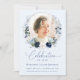 Esta es una elegante y moderna tarjeta de invitación para el funeral para celebrar la vida de tu ser querido. El diseño presenta una hermosa fuente caligráfica y una delicada corona floral con productos botánicos azules, verdes y plateados que enmarcan una foto. Esta invitación puede ser fácilmente personalizada con su propia foto y texto para crear un tributo especial para el funeral de su ser amado, el memorial o la celebración de la vida usando la plantilla proporcionada. Póngase en contacto con el diseñador para cualquier consulta relacionada con este diseño o para cualquier producto que coincida.