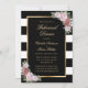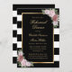 Elegante cena de estilo floral en blanco y negro y dorado con flores rosadas y confeti dorado con un fondo blanco y negro. Elementos coincidentes disponibles. Invitación a la cena de un ensayo floral de Rubor. Invitación a la cena a rayas blancas y negras. Invitación a la cena con ensayo en negro y oro.
