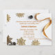 Elegante listón dorado, con conos de pino y Navidades de copas de nieve arboladas Invitación a cenar con texto dorado sobre fondo blanco está listo para ser personalizado con tus detalles. También están disponibles los elementos coincidentes.