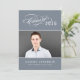 Anuncie su graduado de secundaria o universitario con estilo con esta elegante invitación de graduación de guión e invitación a la fiesta. La tarjeta de dos caras contiene dos fotos del graduado, texto blanco personalizado y acentos caligráficos. Los colores de fondo gris y azul de pizarra se pueden modificar para coordinar con los colores de la foto o de la escuela.