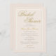 Un diseño de plantilla de invitación a la ducha de novia de marco triple falso grabado en relieve, sencillo pero sofisticado, intemporal y elegante. Los colores son diferentes en tonos dorados, lo que le confiere un toque de color sobrio. Tenga en cuenta que el relieve en los marcos se crea a través de una imagen y que no aparecerá ningún relieve real en la tarjeta. El guión moderno y floreciente actualiza este diseño clásico y tradicional. Para las novias que aman lo nuevo y lo viejo, lo formal y lo moderno.