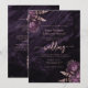 Esta elegante invitación de boda presenta ramos florales morados resaltados con follaje de lámina de oro rosa en dos esquinas, sobre una imagen de fondo de ágata de acuarela morada. El texto personalizable combina fuentes serif, itálicas y de escritura a mano. El reverso proporciona espacio para los detalles de la boda, junto con un código QR que los invitados pueden escanear para visitar su sitio web y responder, lo que ahorra el costo de imprimir y enviar por correo tarjetas de respuesta separadas.